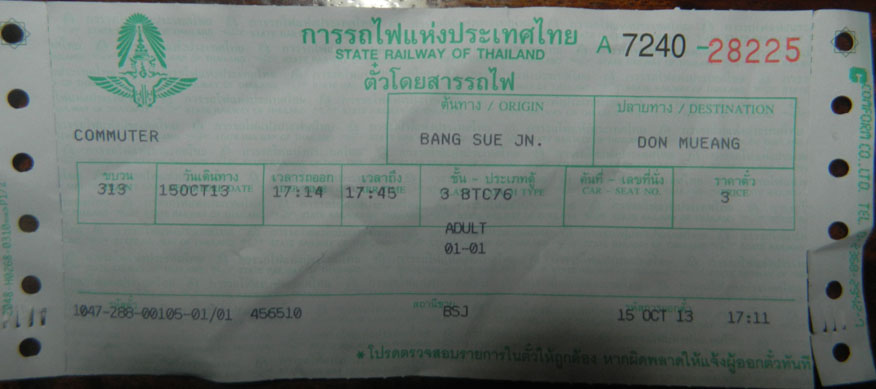 During a quiet week in October 2013 I decided to venture to Bang Sue Junction for the afternoon. I had arrived by aircon’ bus and the MRT connecting via the BTS stop at Chatuchak Park. It took an hour and a half at a cost of 35 baht. Returning by this route in early evening is a different matter; there are long queues for all transport options out of the city. Getting change from two hours would be difficult. Already on the platform I decided to take a commuter train for part of my journey out of the city. The experience summed up all there is to know about the SRT Ordinary Service which uses the most outdated of equipment. The Service 313 departed from Bang Sue at 17.14: The journey to Don Mueang about half an hour. The commuter service would terminate at Baan Phachi in Saraburi Province. The first point to remember is that this service is free for Thai people but farang (foreigners) will have to pay. When I called at the ticket office to get my ticket I was charged 3 baht. This would hardly pay for the paper the ticket was printed on or the system that provided it, let alone the staff wages. The 313, as expected, was crowded but I was happy to stand in the exit doorway. However on exiting Bang Sue station what I hadn’t expected was a theme-park ride. From my position between the last two carriages I’m sure at one stage I was airborne. The train arrived at Don Mueang much as expected which is more than can be said for those gridlocked on Bangkok’s roads.