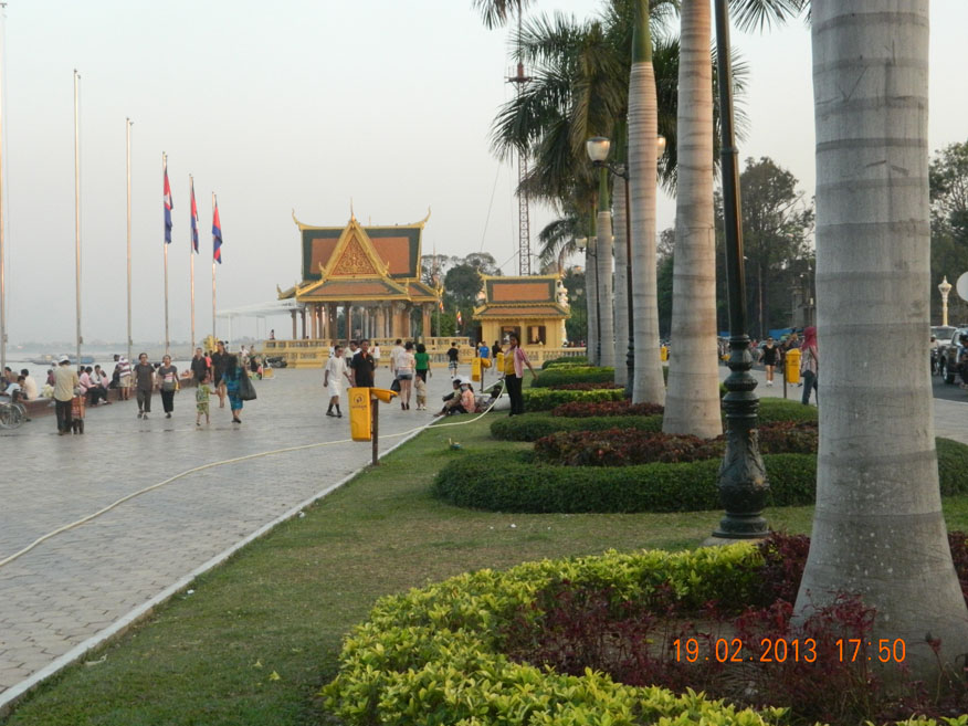 Sisowath Quay aka Riverside..... This is an attractive boulevard running along the banks of the Mekong and the Tonle Sap. It's fronted by a large, long open space with manicured lawns, palm trees and open pathways, all recently re-done as part of a Japanese funded project to upgrade the flood infrastructure along the river. The built-up side of the street is home to cafés and shops and the better class of bar, and is popular with tourists and expat Westerners.