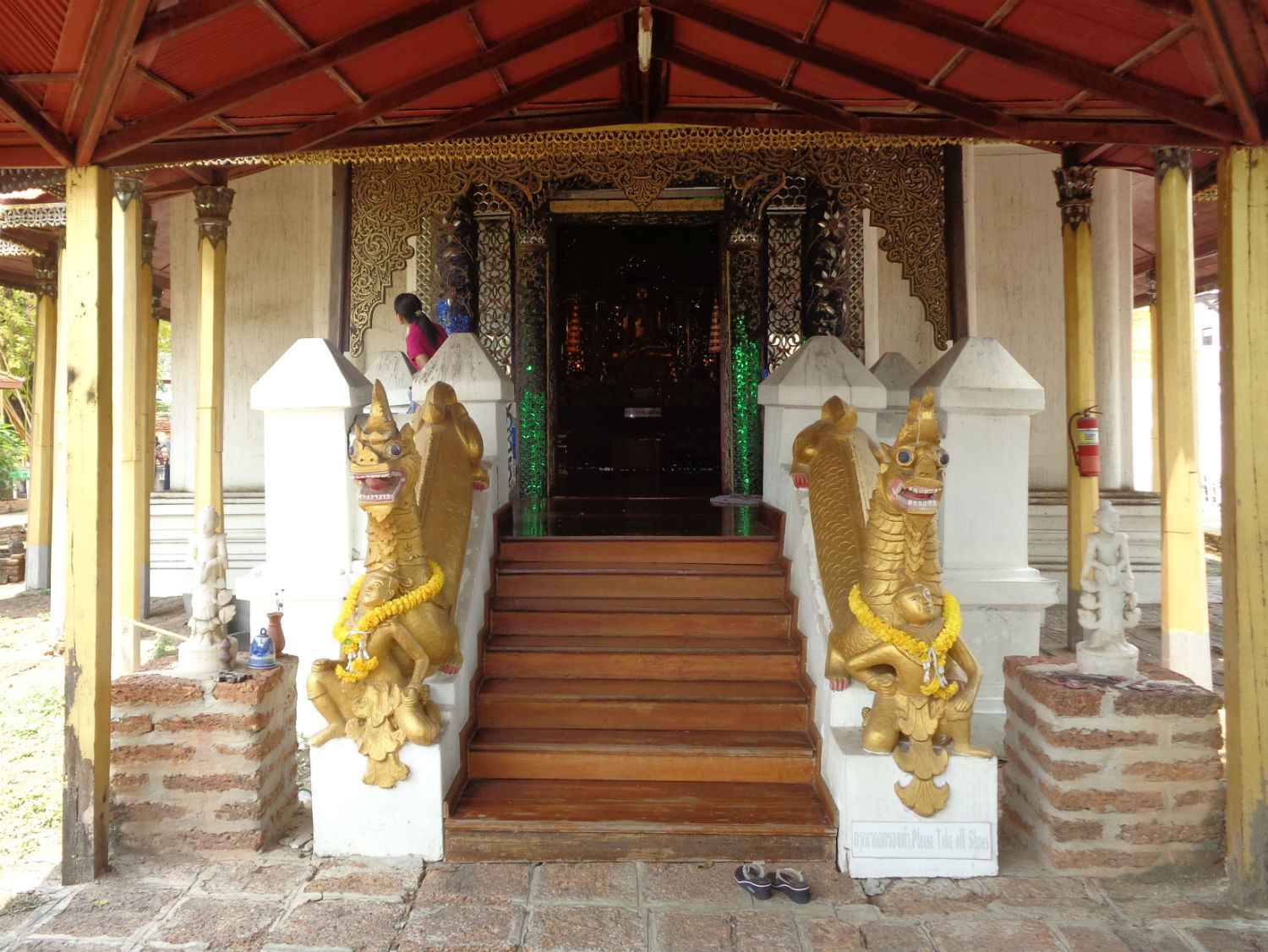 From my observation I can confirm that this is a beautiful temple with walls probably of brick with render thick enough to support the huge teakwood superstructure. The description goes on to record that there was a fire here in 1992 which entirely destroyed the viharn apart from the covered staircase. Today the beautiful Burmese seven tiered viharn has been completely restored to the original design.