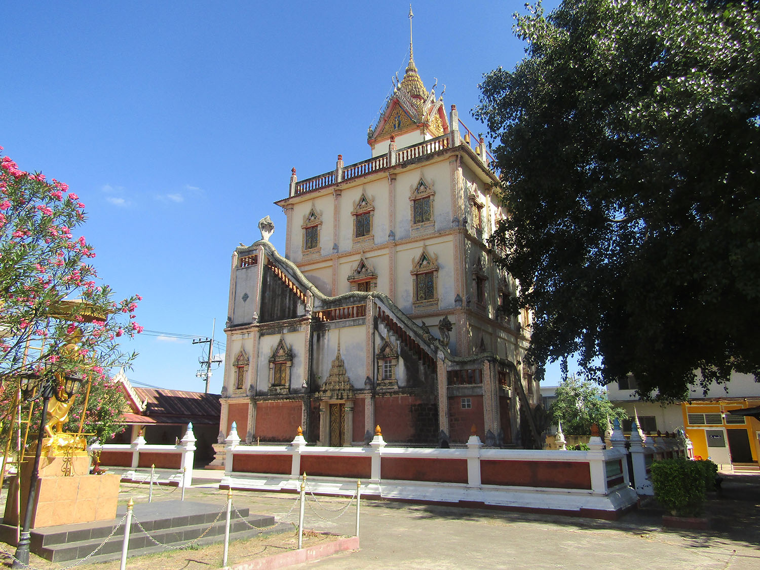 Wat Bueng Phra Lan Chai……..Wat Bueng Phra Lan Chai is located in the centre of Roi Et near the lake known as Beung Plan Chai. No onsite or online information is found for this temple but within the grounds is an old pagoda similar to the one at Wat Klang Ming Mueang. This pagoda located within a small walled lotus pond is thought to have been constructed in the late Ayutthaya period, a site where the blood of war could be washed away.