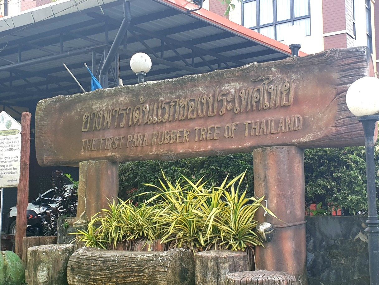 First Rubber Tree of Thailand.......One interesting site we can view however is the First Rubber Tree of Thailand. Rubber trees were first planted in Thailand around 1882 when the country was still called Siam. There is clear evidence that in 1899 Phraya Ratsadanupradit Mahisornphakdi (Khosimbi Na Ranong) first brought rubber trees to plant here in Kantang District.