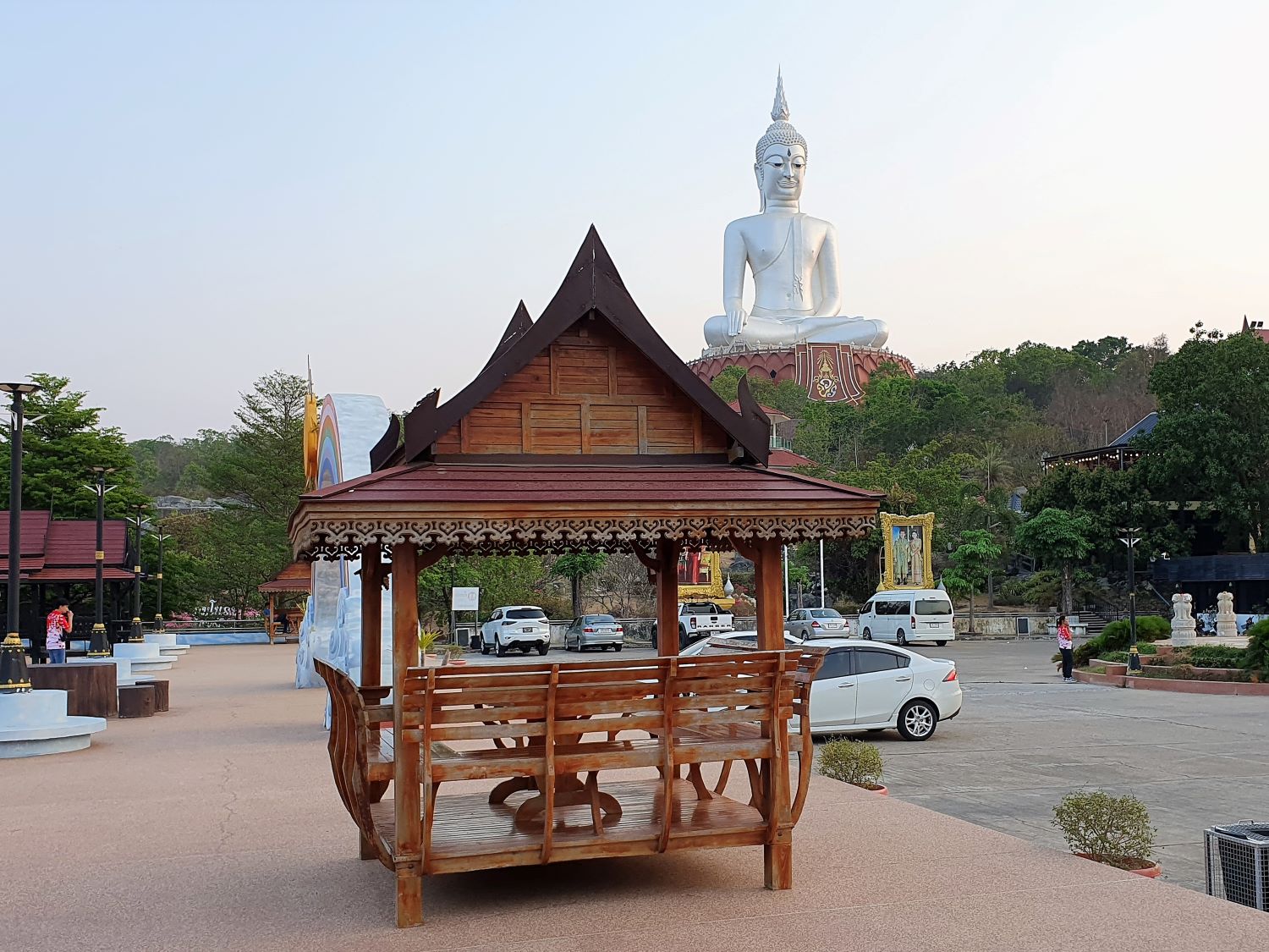 Wat Roi Phra Phutthabat Phu Manorom.......Wat Roi Phra Phutthabat Phu Manorom, is situated on Phu Manorom, a small mountain located in the southern part of Mueang Mukdahan. Within the temple’s compound, there are some interesting attractions to visit. The main feature is Phrachao Yai Kaeo Mukda Sitrairat, enshrined at the temple on top of the mountain. This giant Buddha statue, which can be seen from a good distance, has a lap width of 39.99 metres and a height of 59.99 metres in the posture of Subduing Mara. The total height from the base to the top is 84 metres. Phrachao Yai Kaeo Mukda Sitrairat was built on the occasion of King Rama IX’s 84th birthday anniversary, 5 December 2011.