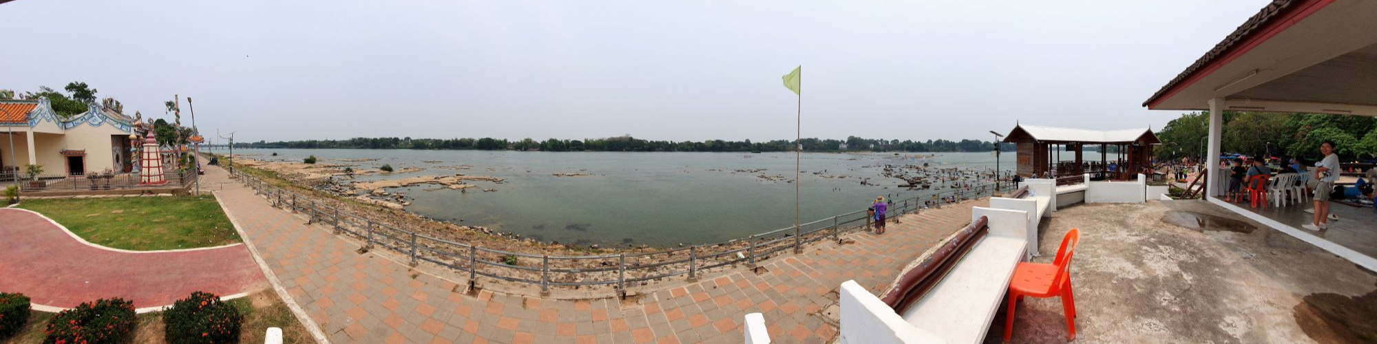 Kaeng Saphue....... Kaeng Saphue is a public park in Phibun beside the Mun River. Normally a peaceful place, today things could not be more different, and the park is quite crowded in keeping with the spirit of Songkran with sections of the river marked as places to bathe. Of course, there are dozens of street sellers distributing all kinds of food, snacks and drinks. A sensible thing to do under the circumstances is to lay out a blanket wherever there is space and enjoy a picnic along with the celebrations. We manage to stay long enough to buy some snacks and get a flavour of what Songkran means to Thai people. It's time to leave Phibun and head for Ubon Ratchathani less than an hour away.