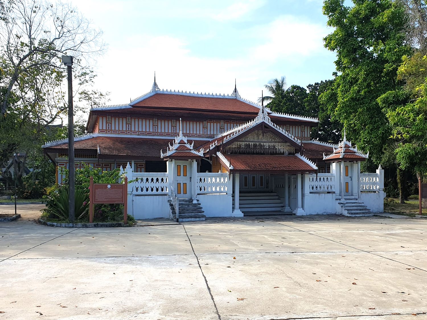 For the second time today I find myself in conversation, this time with local disciples of this mosque. Whatever these people think of me on the inside they certainly don't show it on the outside and I can't but admire their inquisitive and friendly nature. Surely this is how it should be everywhere. Fear is an emotion that complicates everything in life. We now need to head back into the city. Commemoration Royal Pavilion....... The Commemoration Royal Pavilion lies near the estuary of the Bang Nara River. This pavilion was used during the Narathiwat Annual Fair by His Majesty King Bhumibol Adulyadej and Her Majesty Queen Sirikit and members of the Royal Family on occasion of the boat races here. It's time to explore the rest of the coastline as far as the Malaysian border. Wat Chon Thara Singhe....... Wat Chon Thara Singhe or Wat Phithak Phaen Din Thai is an old royal temple located in Chehe Sub-district, Tak Bai District. The temple was built at the end of King Rama IV's reign when Tak Bai was still a part of Kelantan in Malaysia. This temple is historically important because it is a historical site featured in arrangements over the division of land between Siam and Malaya (then a colony of the United Kingdom) during the reign of King Rama V in 1909 marking the area as remaining in Thailand. As a result, the temple is called Wat Phithak Phaen Din Thai, translated as 'temple that protects Thai sovereignty'. Wat Chon Thara Singhe has many Buddhist buildings in Southern Thai style. Riverside Pavilion....... The geography of Tak Bai District reveals a long sand bar known as Koh Yao that runs parallel to the coast while the area behind this sandy beach consists mainly of mangrove. The pavilion is simply a viewpoint looking across the Tak Bai River to Koh Yao. Saphan Koh Yao....... Saphan Koh Yao is the only land crossing point consisting of a wooden bridge. Although substantial it can only be used for motorbikes. At this point I can throw my hands in the air. I've now traveled the entire mainland coastline in Thailand. Wat Phraput....... I've selected Ban Phraput as our next stop despite objection from my partner. Fortunately my hunch is right and there is an amazing old wooden prayer hall here built at a time when steel and concrete were materials of the future. The building style is distinctly Southern with a mondrop and other buildings unique in their design. It's remarkable to think that these buildings are the product of imagination by a previous abbot using local craftsman. No two buildings are the same.