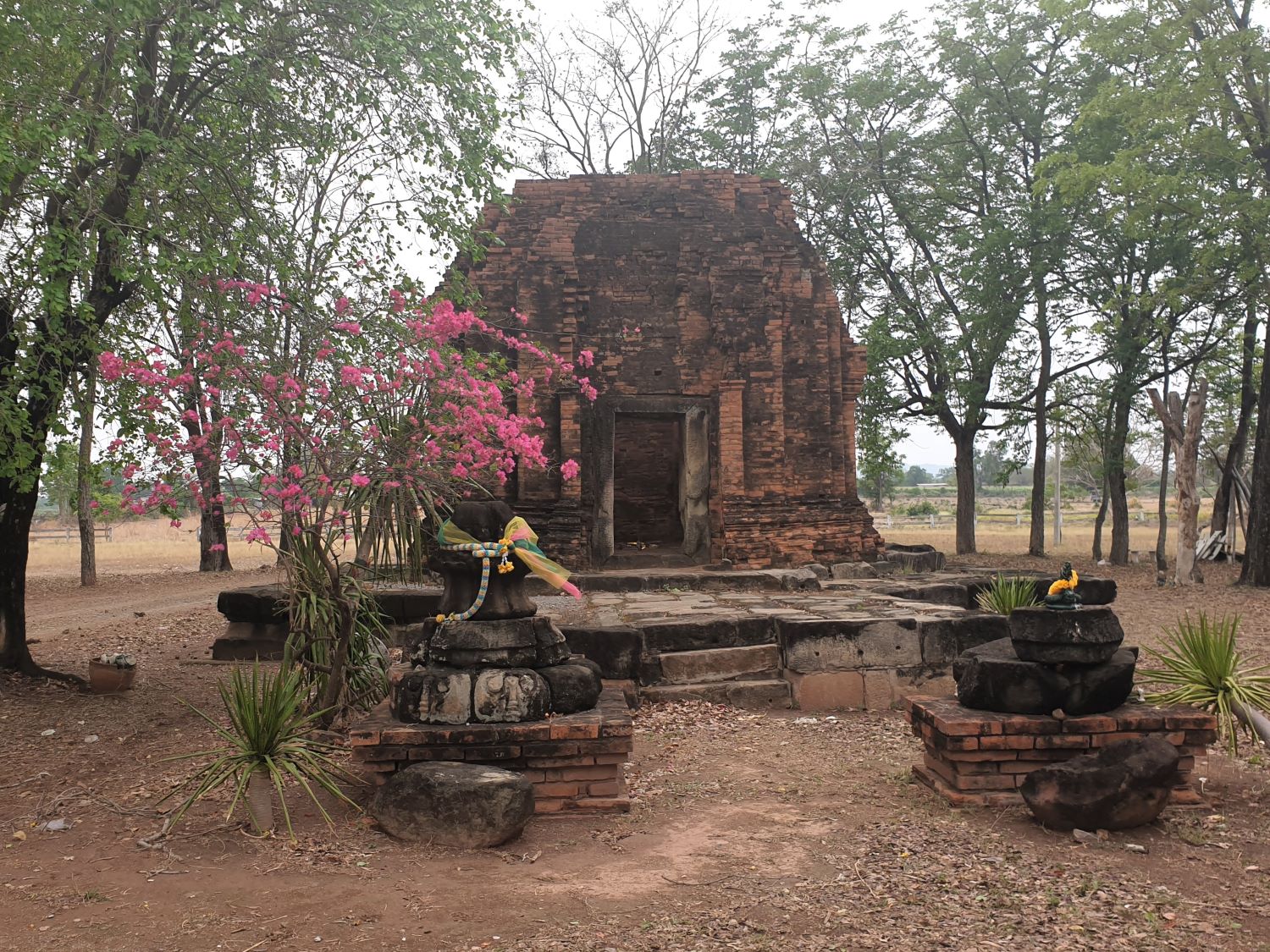 The second location is an area I selected to do a land search but all we have time for is a drive through and nothing obvious appears. We must press on to the third. We are presently in Nakhon Ratchasima Provice but as we head north we enter Saraburi once more but soon exit this province for Lopburi. Here I find something that is obvious. Prang Nang Pohm Hua....... Prang Nang Pohm Hua is an ancient Khmer ruin. Nang Pohm Hua means, 'princess with fragrant hair'. There is no clear evidence of the prang's history but tradition has it that the daughter of a former Governor here used to sit on a stone near a lake after bathing. One day a prince who was visiting the area noticed the princess and became very fond of her. The princess however, had another suitor and a complex love triangle developed and the princess's two admirers became locked in a contest. The princess on realising this became very depressed and decided to take her own life by hanging. In distress the two princes followed by jumping in the river to drown. It is said the the body of the princess was laid in the prang.