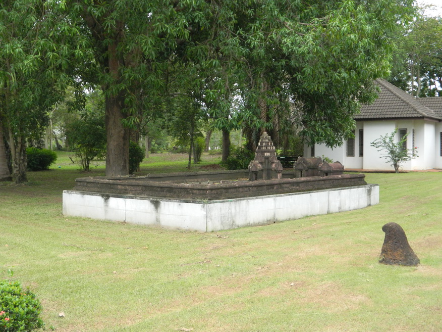 Boran Suthan Sa Morakot (Sa Morakot Ancient Ruins)........I find myself back on Highway 319 and have already identified another important site yet Katoon heads off in another direction and I’m at a loss to identify the site she’s heading for on Google Map. This is one for local knowledge. When I arrive at the site on the left hand side of Highway 319 heading south I find a collection of buildings and sign boards which relate to Boran Suthan Sa Morakot. Here things become much clearer as I finally get some hard data to work with. On site are information boards with details and maps and with a small museum on site as well there is a lot here I can work with. Basically Boran Suthan Sa Morakot is an ancient site that dates back to the early Davaravati Period. What you see today is the result of different period constructions superimposed. The site here concentrates on the Buddhist era. The presence of the biggest and most ancient footprints in Thailand here confirm that Buddhism took hold sometime in the 9th Century during the early Khmer civilisation succeeding the religion of the Dvaravati Period but evidence of both are found in the area. A model of the ancient city in the exhibition hall shows that the site was quite extensive covering a number of parishes. Finally at last I get a handle on this site and how it fits into the history not only of this area but for Thailand as a whole. In addition there are tourist maps of Prachinburi as a whole which I can now use for future site visits. It’s a great start but now we head back to the site I earlier identified.