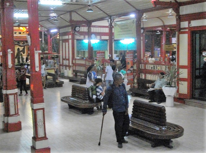 The engine arrives late at 13.05 but once married with its couches this ancient locomotive heads slowly out of Bang Sue, its train hardly full of passengers. Passage to Prachuap Kiri Khan..... I settle down to this potentially grueling journey but like the journey back from Pattaya earlier I can rest my legs on the seat opposite. Still this sunny day will afford little respite except for the steady airflow from open windows often bringing with it more than just air. At two coaches back, exhaust fumes from the engine are often seen drifting through the carriage. From Bang Sue where the line splits to the north and west the train heads across the Chao Phraya River following the route of the Purple Line extension of the BTS (Bangkok Transit System) rail network. New stations are being constructed as far out as Taling Chan, allowing passengers for South Thailand to use the rapid transit systems to speed up their journeys south. The journey is generally uneventful. Time passes as I stare out of the window observing activity at the frequent station stops and in the compartments themselves as vendors ply their trade offering refreshments mainly of rice or noodles and iced drinks. The passage to Prachuap often gets interrupted as a reminder that all other traffic on the line takes priority. After Taling Chan, the line reverts to a single track. The 251 is obliged to wait at station sidings when up-line trains require passage. At one station Pak Tho, the 251 is obliged to wait for the Express behind to overtake. Oddly this train 171 was the one I originally intended to travel on. At Khao Thamon station before Cha-Am there are some unusual visitors. A monkey troop has taken up residence enticed by tit bits discharged from carriage windows. An orange sun starts to set over the western hills as the train approaches Cha-Am. Then it's into Prachuap Kiri Khan province and by the time it reaches Hua Hin, dusk approaches. It's still some way from the provincial capital but at 19.30 the 251 Service terminates. I'm informed that if I walk straight out of the station about 15 minutes, I will reach the seafront and find accommodation. Strangely there is little in the way of transport waiting at the station. This is certainly no Pattaya or Bangkok as I find the pace of life almost a culture shock. Suksant Hotel..... I’m soon at the seafront and it's getting late, so I'm prepared to accept the 650 baht for a standard room at a rather imposing hotel on the beach road. It's rather showing its age and not in the resort category, many parked goods vehicles showing it is used as a stop-over for long distance drivers. I freshen up and venture out for a meal. At a nearby square, mobile food vendors offer a variety of foods. The Night Market culture thrives here particularly in the provinces, a most convenient way of sampling local dishes at very little cost. I hardly need a beer to set me up for a good night's sleep. Next Page