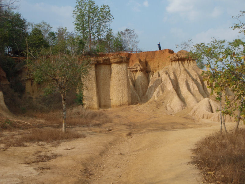 Phae Muang Phi Forest Park is located about 18 km from the town on Highway 101. It is regarded as Thailand's Grand Canyon. Phae Muang Phi is noted for its fantastic sandstone formations. Phae means a shrub area and Muang Phi means city of ghosts in Thai. As it is a large quiet haunted place and nobody lives around there, people will easily lose their way when going inside. However, it is well worth a visit for those who appreciate spectacular natural rock formations.