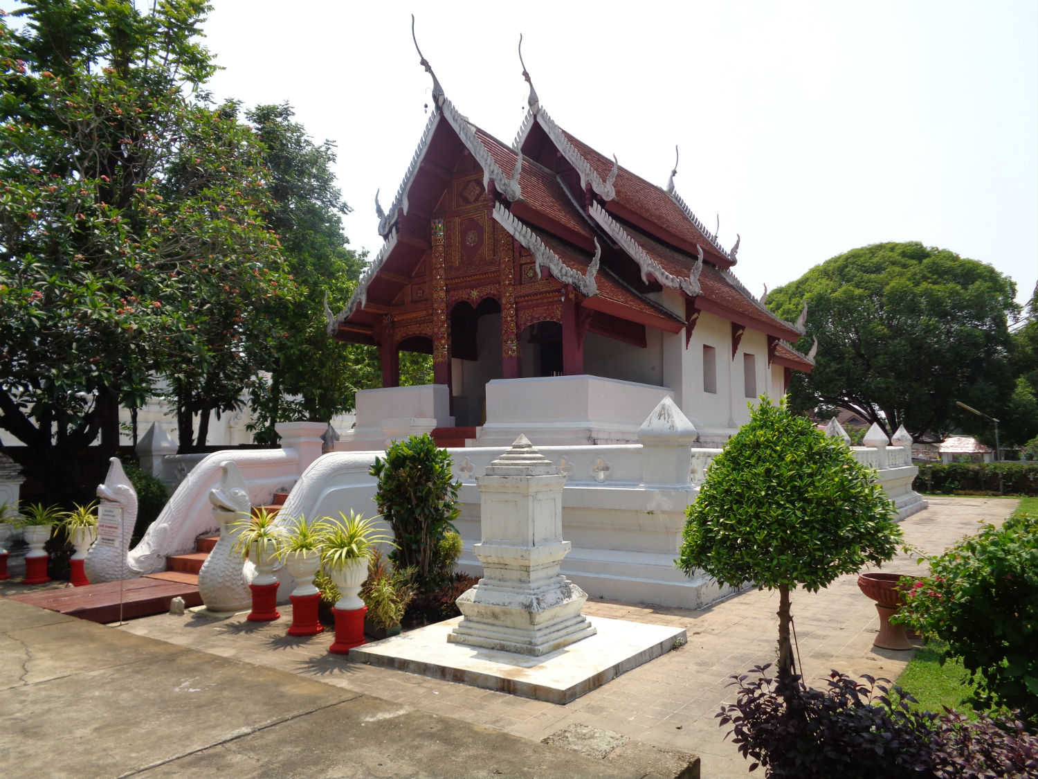 From my observation I can confirm that this is a beautiful temple with walls probably of brick with render thick enough to support the huge teakwood superstructure. The description goes on to record that there was a fire here in 1992 which entirely destroyed the viharn apart from the covered staircase. Today the beautiful Burmese seven tiered viharn has been completely restored to the original design.