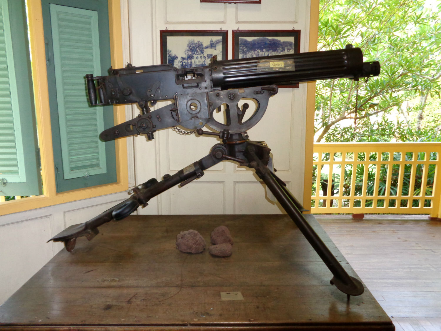 Ban Pong Nak........Ban Pong Nak appears here as a result of talking with residents rather than studying maps. That so, I feel it may not be that important, particularly as it seems hard to locate. Finally when we do locate it, it’s actually inside Fort Surasakmontri, an army base to the east of the city. Not for the first time I find myself in an army camp guarded by military police who seem to have no qualms about us visiting the site. As I stated on the last occasion, I would consider this a security issue and would not be allowed in the UK without official clearance: Certainly the official line is that you need to make an appointment first. So what is at Ban Pong Nak? Well it consists of just one building modeled on a European design I would say around 1900. There are a couple of reasons for visiting this site. For Thais there is an historical significance as it was a building two former Thai Kings staying in during official visits. It probably was used by visiting high ranking officials too. The other reason to visit the site for those interested in military matters is the small collection of exhibits including a number of small arms and other weapons. Not for the first time today I see something of British interest, a heavy WW1 Vickers machine gun, the first time I’ve been up close to one and a vintage Tommy helmet. Some of the bayonets displayed are also British.