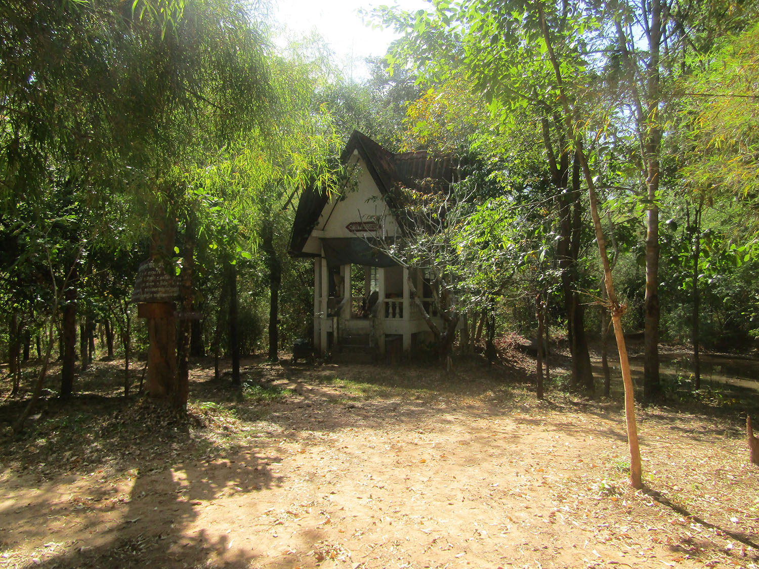 Lampao Dam……..The Lampao Dam is the main reason for returning to Sahatsakhan today. As we pull into a clearing occupied by food sellers, I note that there is an outflow from the dam along the bank of which they’ve set up sunshades for visitors, just another recreational feature, but I’m more intent on reading about the dam itself on the signboard.