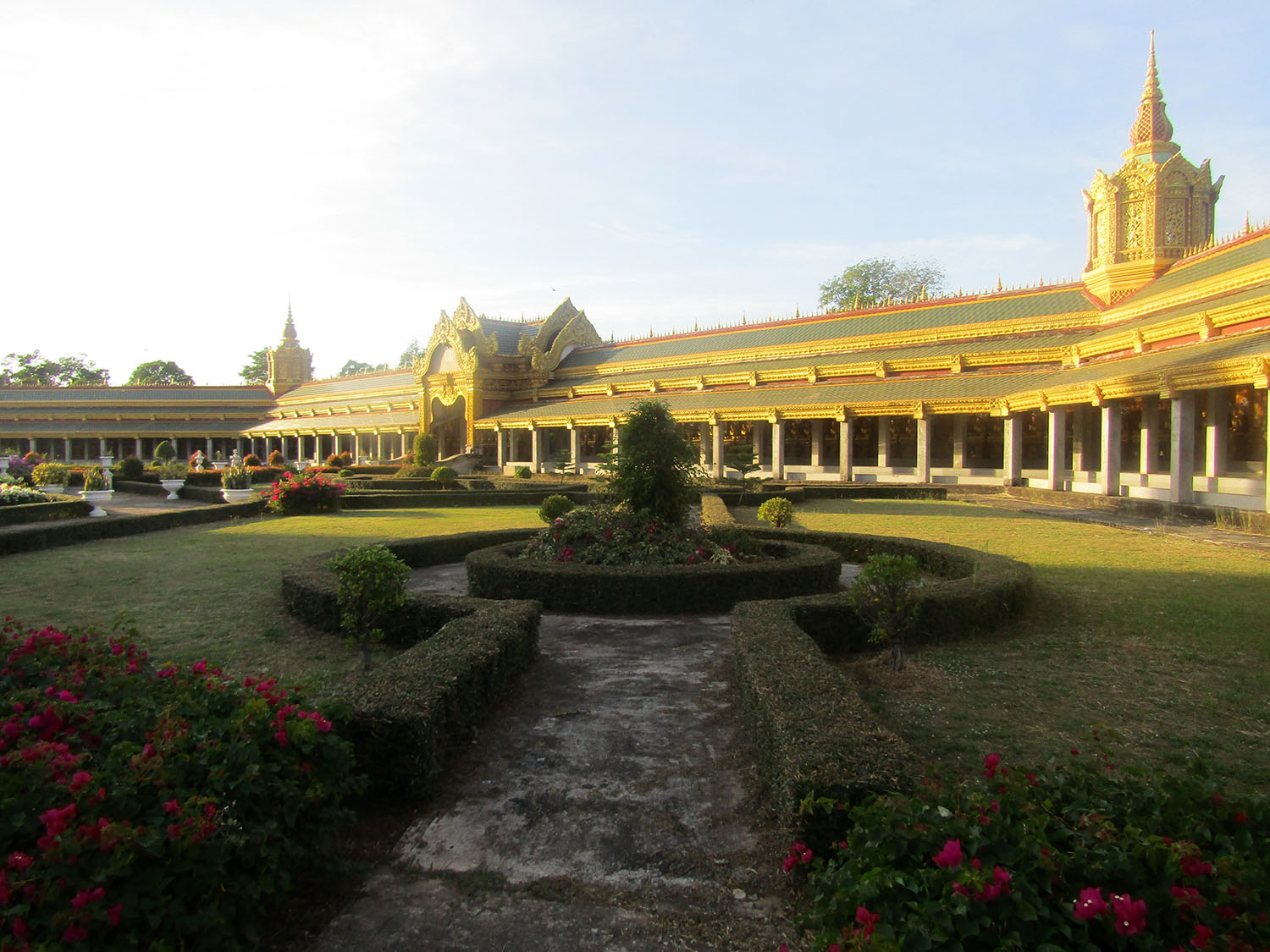 Phra Maha Chedi Chai Mongkhol……..Arriving at Phra Maha Chedi Chai Mongkhol later than I expected, now well after 4pm, I soon realise that it won’t be a question of just firing off a few shots with my camera. Seen on the hillside from a good distance, the Phra Maha Chedi Chai Mongkol or “The Great, Victorious and Auspicious Pagoda” is one of the largest chedis (pagodas) in Thailand. It is located in the grounds of Wat Pha Namthip Thep Prasit Vararam. This huge chedi is 101 meters long, 101 meters wide and 101 meters high and was built on a plot measuring 101 Rai, which is about 40 acres. The number 101 comes from the name of the province it is located in, namely Roi Et, which means 101 in Thai.