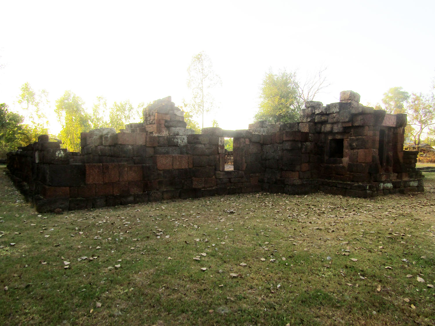 While for the most part, the regional office of the Fine Arts Department covering this province has done a good job, at Ku Pon Ra Kang there is no information board in English, only in Thai. However, based on observation and some attempt at translation it's established that this monument was constructed in the 12th/13th centuries. By its architectural style it is believed to be an arokayasala (medical station/hospital) built during the reign of King Jayavaman VII (1181-1218). Ku Pon Ra Kang consists of a single tower and porch and another building in the southeast corner of a rectangular compound with a doorway facing east. The prasat is built of laterite with sandstone doorways and lintels, while the outer wall is also built with laterite bocks. Outside the compound in the northeast corner is the pond. The monument is Khmer style and currently in relatively good condition. The carvings on the lintels show the by this time there was conversion to Mahayana Buddhism here.
