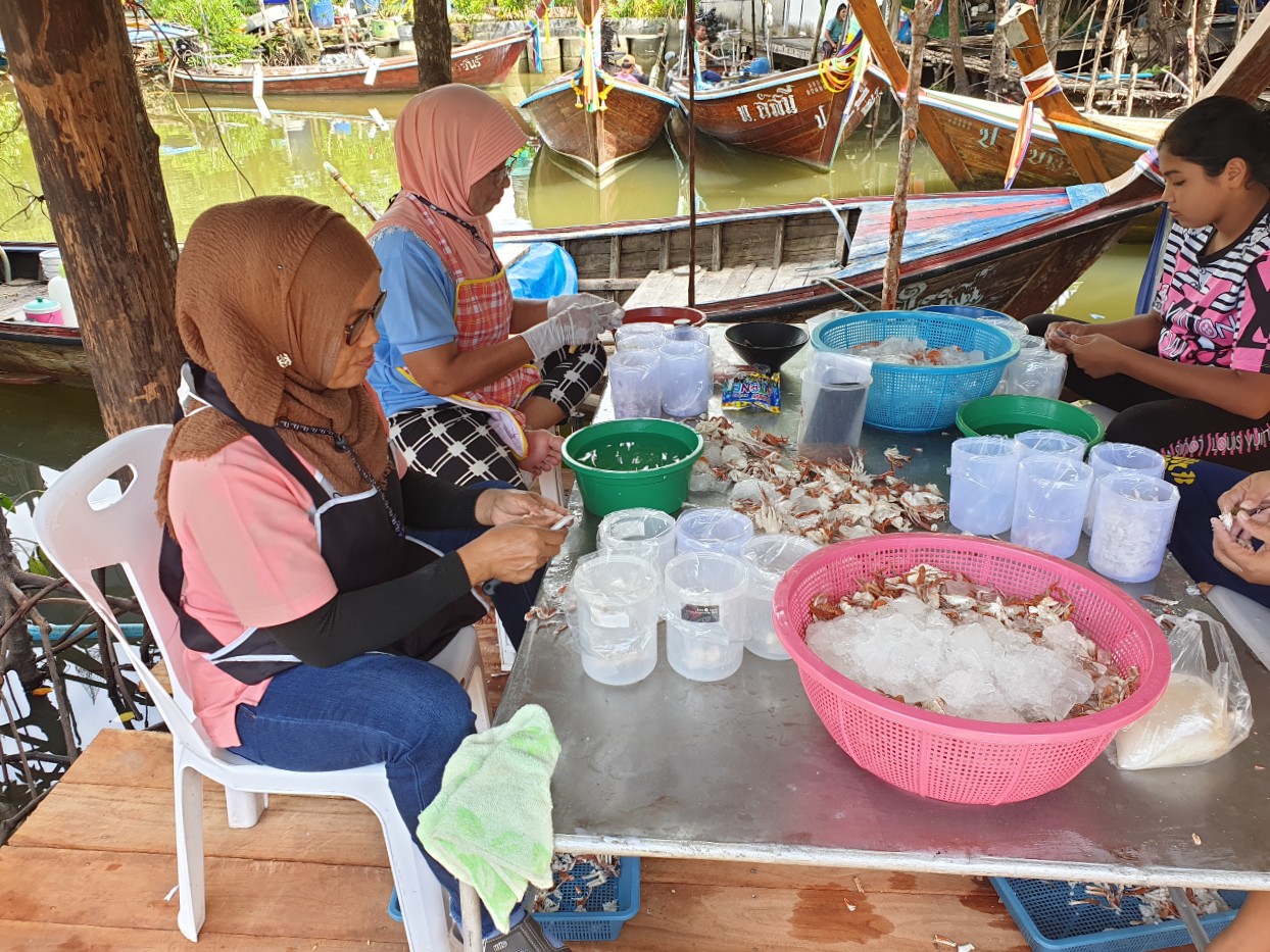 Ban Nam Lat.......For new visitors to Thailand the sight of rua hang yao (Thailand's colourful long-tailed boats) shouts 'get the camera out', such is the fabulous photo opportunity they present. Yet, almost everywhere there is access to any significant volume of water, you will find these boats: They are just that common. Katoon has located one of so many fishing villages on the Andaman coast. This one called Nam Lat. Here my dear companion who could mesmerize a scarecrow engages with the local community. What happens next surprises me because I thought fishing villages were all about catching fish. Well, I learn here there is a lot more to it than that. The villagers here take what nature provides but they also know that in order to survive they have to give nature a helping hand. One local man keeps crabs, squid and other sea creatures until eggs they produce hatch out. They are then released back into the water where they have a much better survival rate. Very soon I'm given the task of releasing newly hatched crabs into the bay, a sign of being blessed with good luck.