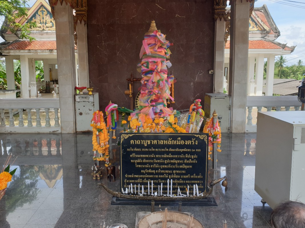 City Pillar Shrine (Lak Mueang).......As we head out of Trang it's gone 10am. Our first stop is not on my list but just 10 minutes southeast of the city near highway 403. It's unusual to see the symbolic pillar so far out of the city but I note that it was renovated in 1992. Located on the roadside of Trang-Kantang Old Street, Khuan Thani subdistrict, Kantang district, the City Pillar is heart and soul as well as a place to worship for Trang people. It stands on the site where the first town was located.