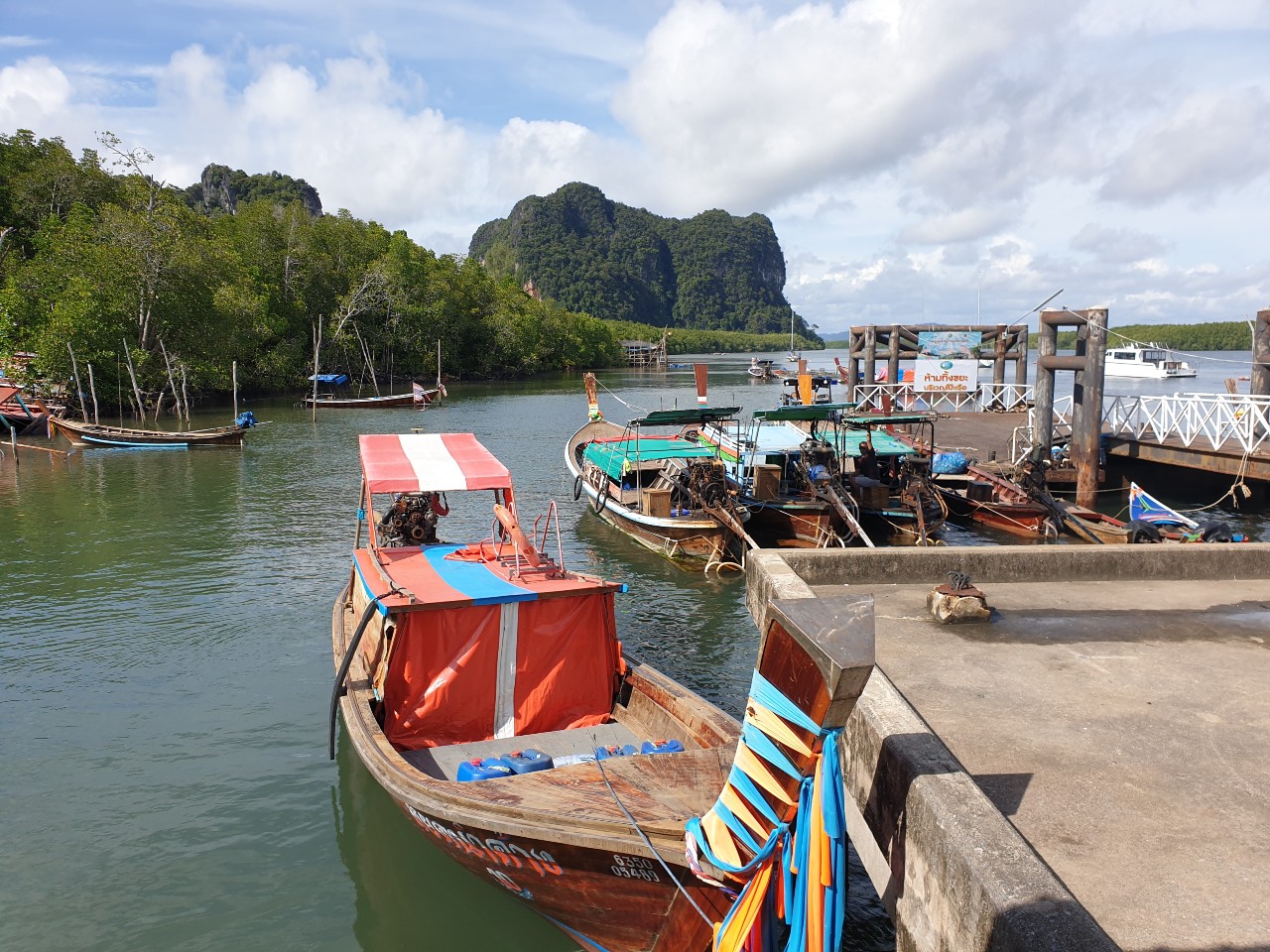 Haad Yao Pier.......It's just a short distance to Haad Yao Pier, the furthest point we can get before the Lat Chao Mai estuary. Such is the nature of the coastline in Trang that there seems to be a pier at every turn. The pier at Haad Yao is one of the larger ones. The obvious destination for boats leaving here is Koh Libong hardly four kilometres away and in direct view of the pier. Libong has an interesting attraction, the stone bridge but I'll just have to put it on my wish list as it's getting rather late now. Of course, there are a number of other locations that can be reached from this pier too. Just like everywhere else the more people per boat the cheaper it becomes. To help the situation, boats only depart when enough passengers arrive. Now, quite late in the day there is little activity here. There are still more sites on my list but time doesn't permit much more activity today and we must start the return leg.