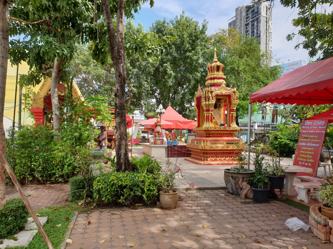 The current buildings in the temple include 1) Maha Rattana Chedi Sri Trai Loka Dhatu, 2) Mondrop Pathom, 3) Phra Bhudda Nilavarno Silotrapyudom or Luangpho Dumm, 4) Nakara or Hell Outdoor Museum, 5) Sculpture of Naga, 6) Vantah Chulamani Stand and Nagachedi Srinagin Pier, 7) Other buildings.