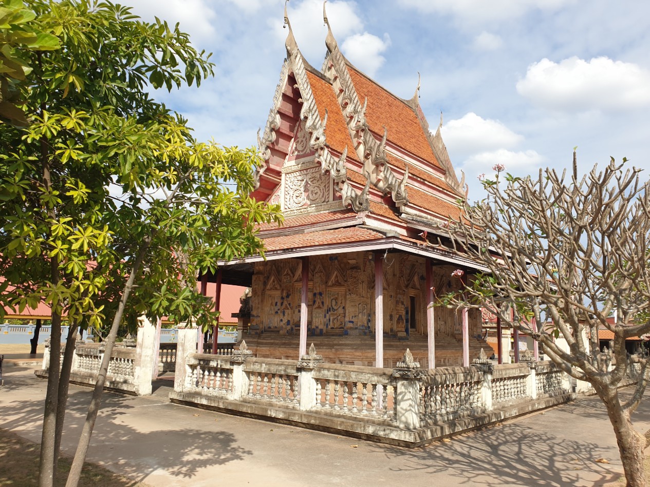 The viharn at Wat Chetiyabhumi is built in traditional Thai northeastern architectural style and located to the east of the pagoda. The year of construction has not been discovered but it was built of brick. The gable roof is covered with diamond shaped roof tiles and the elaborate pinnacle consists of a roof finial or 'Chao fa' style carved bargeboard. The next and last location is not that far away in the same district.