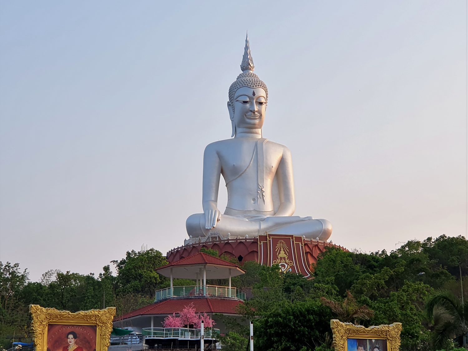 Wat Roi Phra Phutthabat Phu Manorom.......Wat Roi Phra Phutthabat Phu Manorom, is situated on Phu Manorom, a small mountain located in the southern part of Mueang Mukdahan. Within the temple’s compound, there are some interesting attractions to visit. The main feature is Phrachao Yai Kaeo Mukda Sitrairat, enshrined at the temple on top of the mountain. This giant Buddha statue, which can be seen from a good distance, has a lap width of 39.99 metres and a height of 59.99 metres in the posture of Subduing Mara. The total height from the base to the top is 84 metres. Phrachao Yai Kaeo Mukda Sitrairat was built on the occasion of King Rama IX’s 84th birthday anniversary, 5 December 2011.
