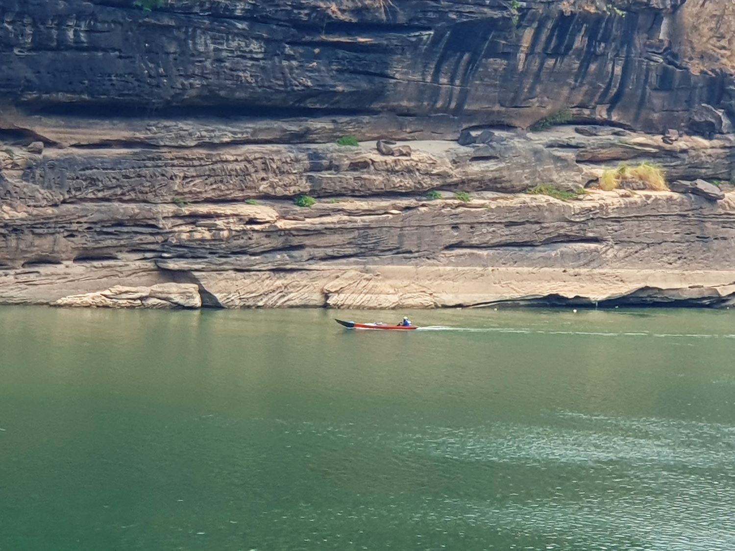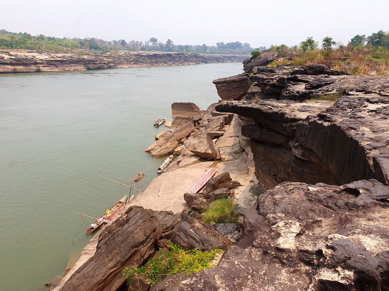 Pha Chan....... As with the Giant Rock Pillar there is no entry fee here in this part of Pha Taem National Park. Pha Chan is a rock ledge viewpoint and at low water, reveals the Mekong water course as straight as any canal. The beauty here is that there are steep cliffs of eroded sandstone on either side cut by the power of water and as symmetrical as if cut by a human hand. Yet even here local fishermen have placed ladders to reach the water far below.