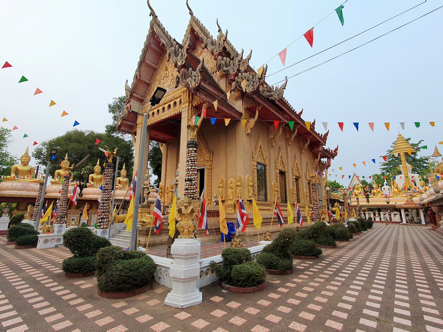 Wat Phu Khao Kaeo....... Wat Phu Khao Kaeo is located on a small hill south of the town. The temple is known for its intricate glazed ceramic exterior and guardians. The rooftop was made in golden pavilion style decorated with Thai pattern and Indian-style pillars. The history of important Buddha relics can be found on the ceilings. Downstairs, the space is used as a pavilion.