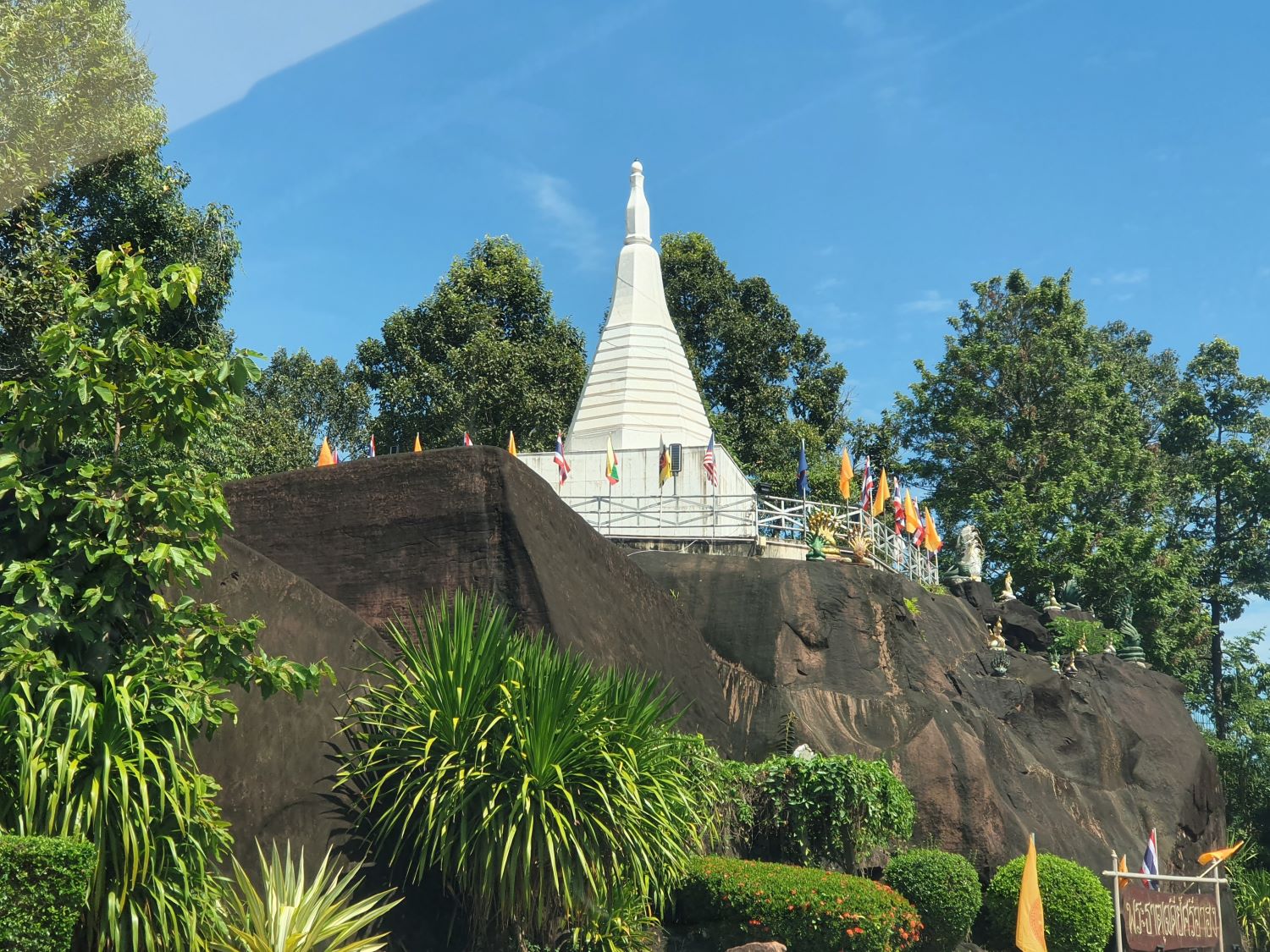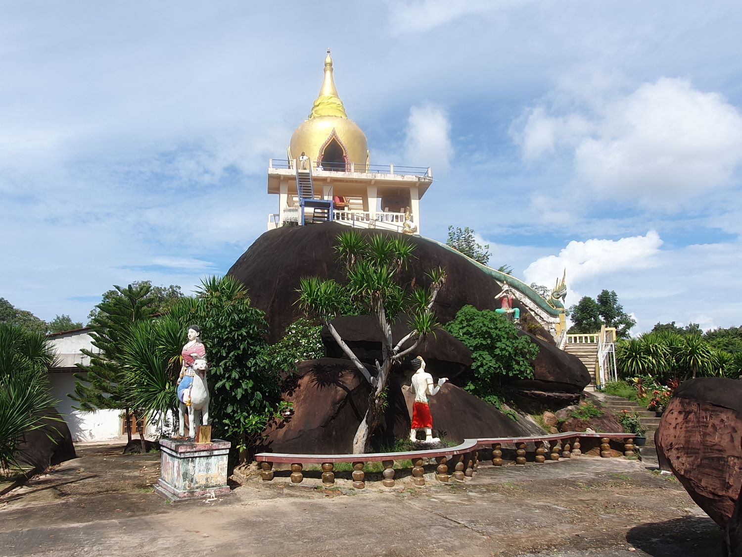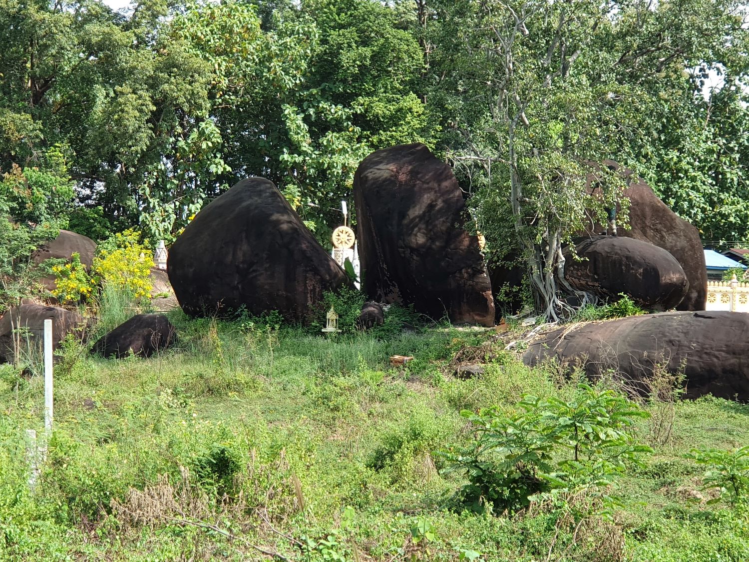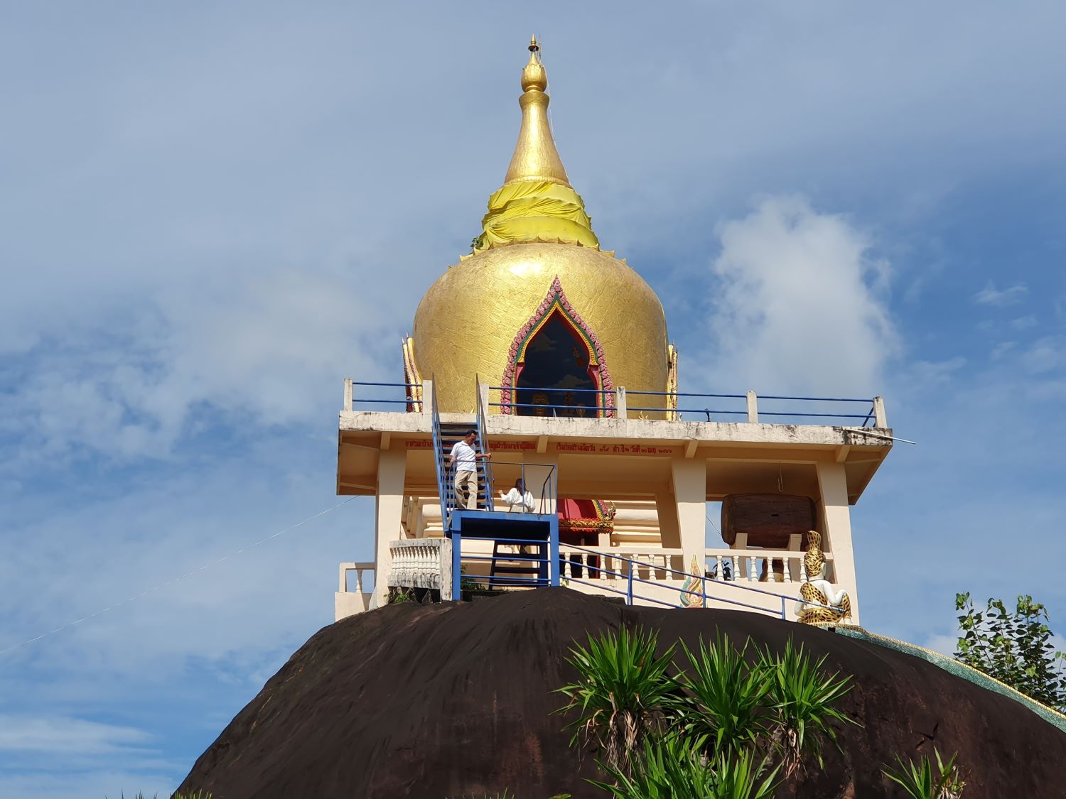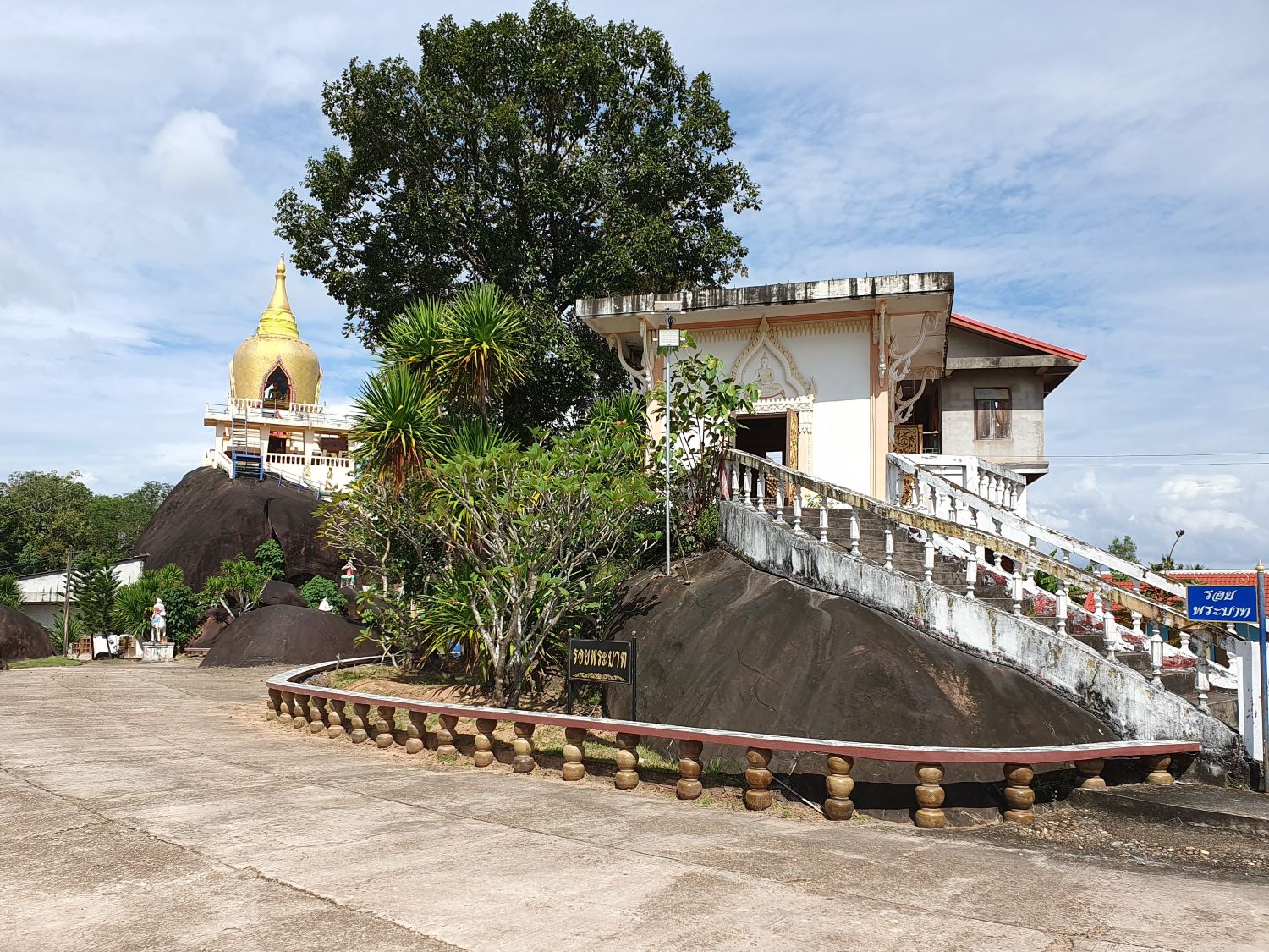 Wat Sawang Arom (Wat Tham Sri Thon)....... Wat Sawang Arom or Wat Tham Si Thon is located on the rocky ground of a hill. It is shady with trees with a small stream flowing through it. The Ubosot (ordination hall) stands on a giant boulder. From here, a view of Laos can be seen in the distance. Down below, a reclining Buddha image is housed for the people to pay homage to. This is one of the main temples of Bueang Khan Province, covering an area of 40 rai. According to history, the area used to be the home of Pak Khat villagers, who migrated from Ban Pak Kluai, Pak San district in the Lao People's Democratic Republic.