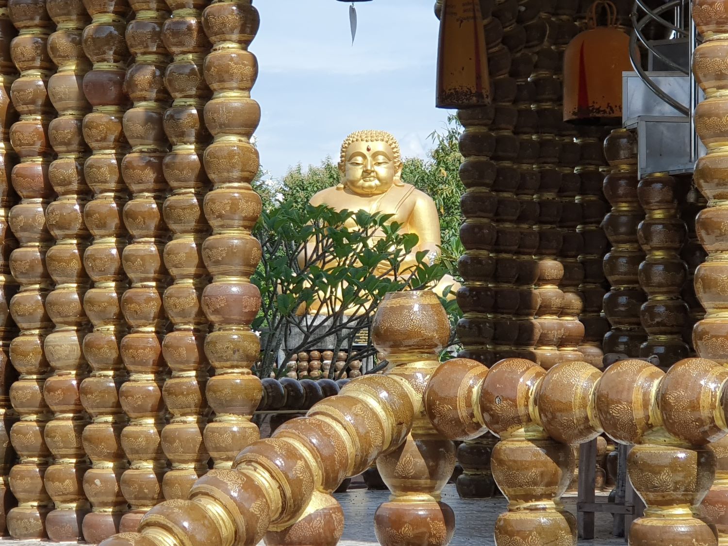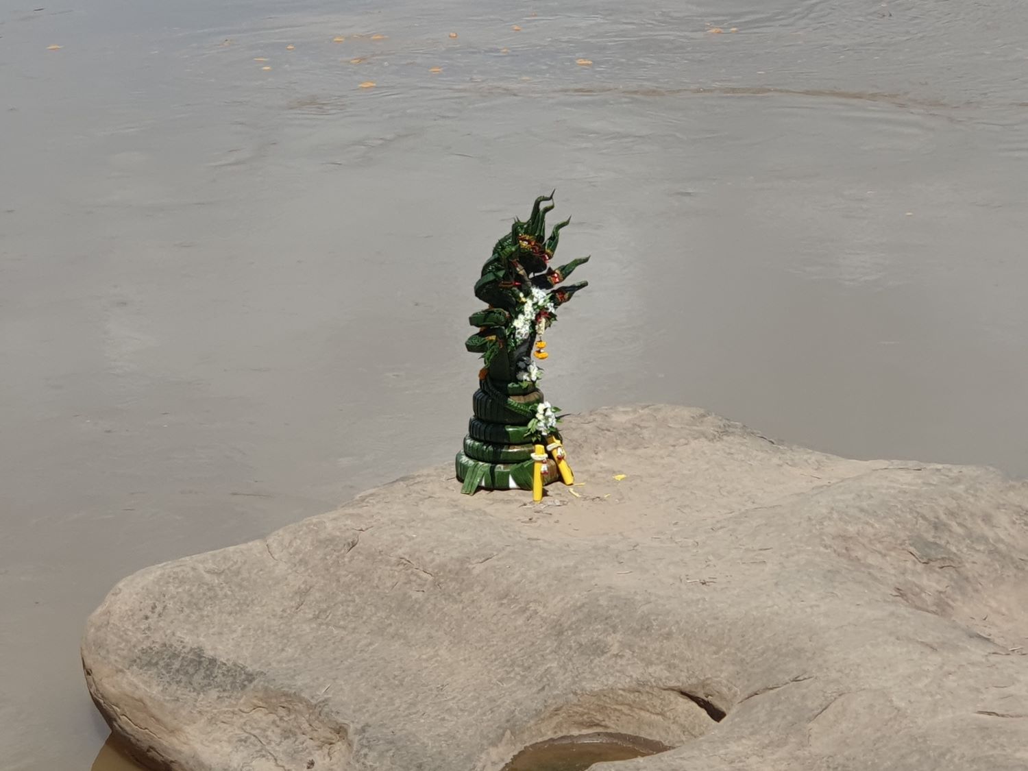 The Navel of Mekong (Mekong mid-point)....... The Navel of Mekong is located at Wat Ahong Saliwas. The navel is an island located at one the Mekong River's narrower points. This location has attracted many visitors on this auspicious day. Under the shade of a marquee, a smartly dressed hermit is giving a sermon. He loves the sound of his voice that much that his microphone is attached to a truck with and amplifier and huge speakers. If I've got the translation right, the hermit is appealing to the serpent in the water not to eat him. At this point the heat is getting unbearable and I'm looking forward to reaching our hotel. Just one more attraction flags up on Google Map.