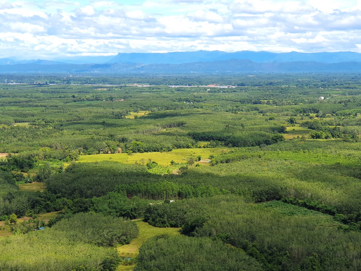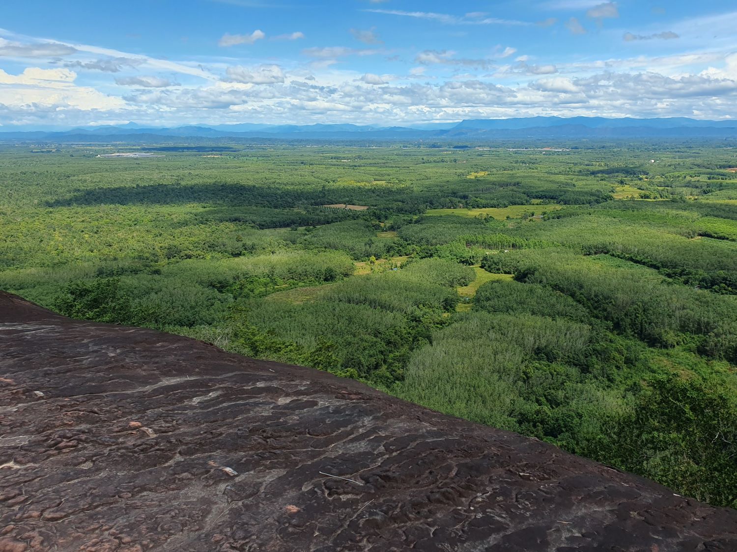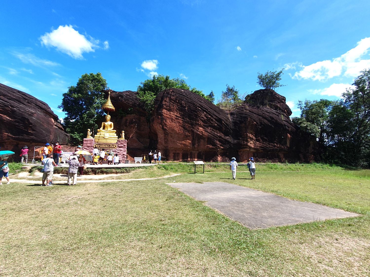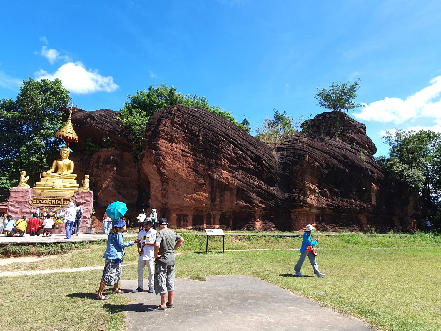 Wat Phu Tok...... Phu Thok meaning 'lonely mountain' in the Isan language, is a 359 metre high isolated hill in Na Sabaeng Subdistrict, Si Wilai District. Phu Thok is an emblematic sandstone outcrop that is both a local landmark and the symbol of the province of Bueng Kan. It appears in somewhat stylized form in the provincial seal. Phu Thok has two peaks, Phu Thok Yai and Phu Thok Noi. Wat Phu Thok, an important Buddhist temple, is in a cave near the top of the smaller peak. The summit of this massive rocky hill can be reached via a wooden walkway. The top has views of the surrounding flat countryside.