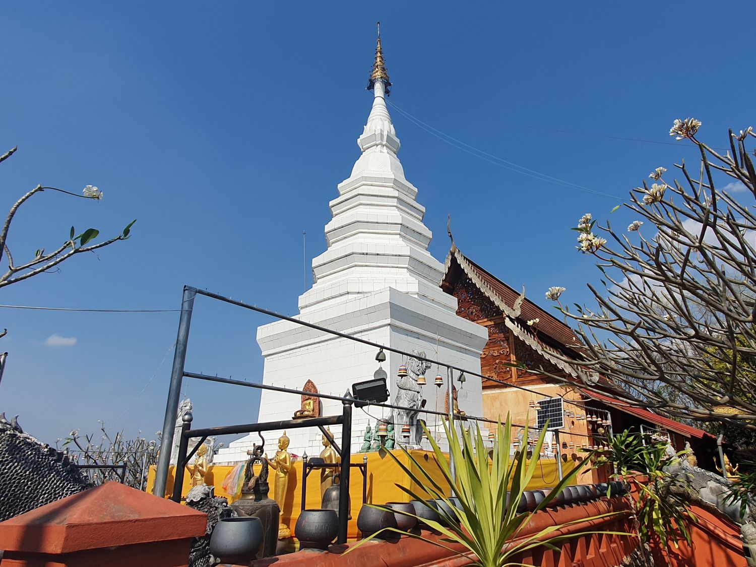 Prathat Doi Hang Bat is a square shaped white stupa with a white spire crowned by golden chatra. The founder and the construction date remain unknown. Legend has it that the Buddha, during his lifetime, paid a visit to the hill where the temple would later be founded and prepared his alms bowl for a daily alms round. In the local dialect, the act of preparing an alms bowl is called 'hang bat'.