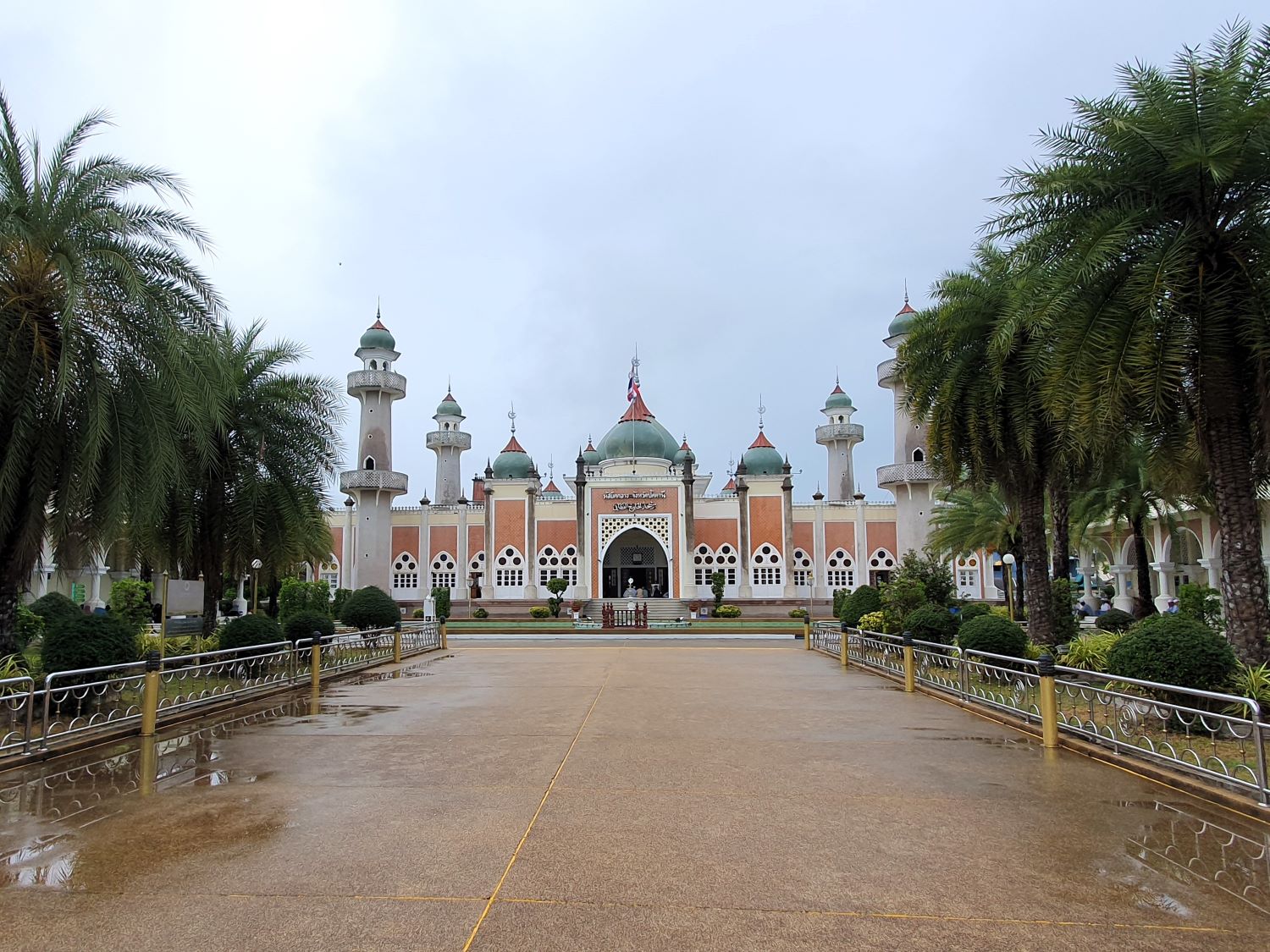 Naturally given the rain this has not helped with the schedule and I'm already pondering the consequences of this. We must head quickly to our next attraction but the city traffic is proving stubborn. Pattani Central Mosque....... The Pattani Central Mosque was built in 1954 and took 9 years to complete. It was officially opened by Field Marshal Sarit Thanarat on 25 May 1994. The Mosque's construction was to serve as the central religious hub for Thai Muslims in the southern region. Approaching from the front entrance, a long corridor leads to the mosque building, with palm trees lining the pathway, providing much-needed shade. At the centre of the mosque's front area, there is a large fountain pool that enhances the external landscape. The mosque building itself resembles the architectural style of the Taj Mahal in India.