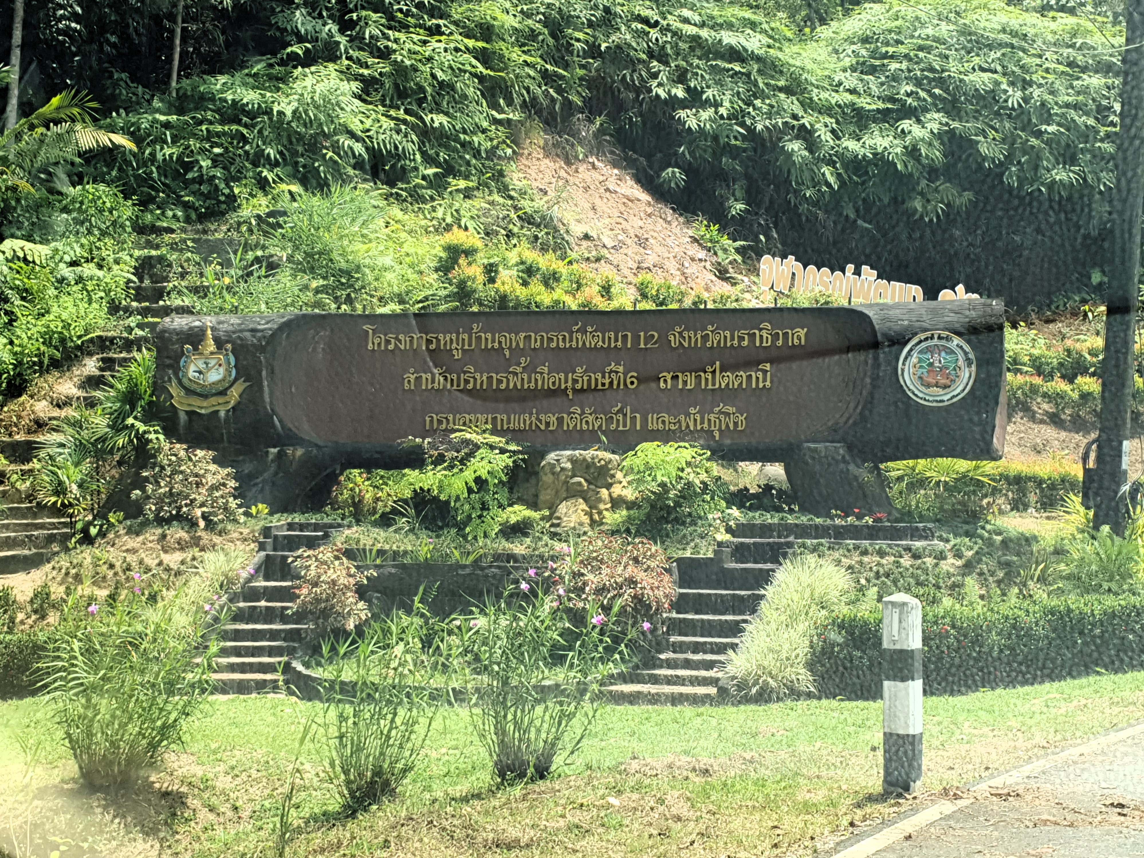 My last stop is at the Genting Market to look for a sports shirt but I fail to find what I want. We finally leave the town heading west. This will be via a different route from the one we used to get here and takes us into the mountains of central-southern Narathiwat. This will allow us to pass through more of Narathiwat's districts and there is one in particular that has something more of interest. Sukhirin District....... Sukhirin is a mountainous district and the town itself is quite small with a lot of road workings taking place here. The district is criss-crossed by rivers running off the mountains that straddle the border. Bridge rebuilding and general upgrades are ongoing and the area is prone to landslips after the rains. This district is the location of a locally important landmark of historic significance. Kampung Chulaphon Patana 12....... We arrive at Kampung Chulaphon Patana 12 around lunchtime and the village here is deserted.