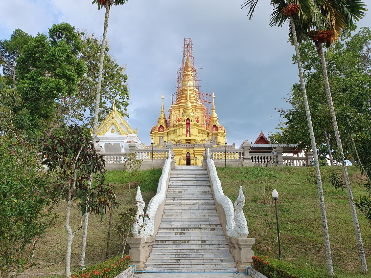 There are now these other attractions which we need to find out more about. Two are waterfalls and one is a hot spring. On collecting information and having reached the most important attraction in the area we now decide to kick the can down the road and head back to Betong early for a change. These minor attraction we can have a go at tomorrow on the way to Yala. We reach the town and have time to visit one of its major attractions. Wat Phuttha Thiwat....... Wat Phuttha Thiwat is located to the east of town and its golden chedi stands out above the city on a hill. Construction of this temple started in the 1990s after the Communist surrender. Princess Sirindhorn visited the temple in the early days of construction in 1992 and planted a white champaca tree in commemoration. The Phra Mahathat Chedi Phra Phuttha Thamma Prakat here which houses a Buddha Footprint as well as other treasures is still having its golden tower painted.